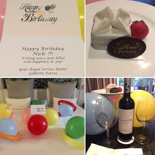 As part of our Paradisus La Perla Playa del Carmen Royal Service Resort stay, we had our own "Butler". His name was Gilberto Torres and he was OUTSTANDING!!! When David and I checked in, the staff briefly asked us why we were there and naturally we mentioned my birthday/25th Anniversary. We thought nothing of it until...the day of my birthday--after spending it all day by the pool (of course!), we returned to our room and found it filled with MANY balloons, a delicious white chocolate cake and bottle of wine, as well as a lovely "Happy Birthday" note from Gilberto, our "Royal Service" Butler: