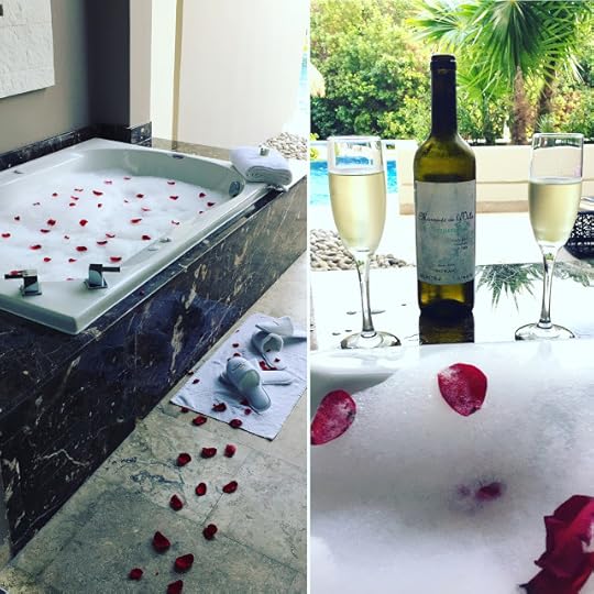 Happy 25th Anniversary: A rose-petaled path to the outdoors Jacuzzi, filled with soapy/bubbled water and a bottle of wine. David and I could not believe it! Gilberto had really OUTDONE himself! --when I saw him--I went up to him and hugged him and slapped him the way I do to someone I ABSOLUTELY want to say "Thank You!" and MUCHISIMAS GRACIAS!
