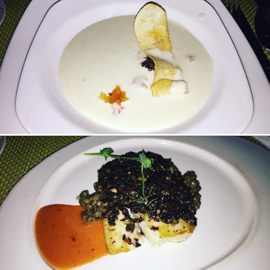 Cheese Cream Soup (Top) and Grilled Grouper Main Entree (Lower) at "La Palapa" Royal Service Restaurant--Paradisus La Perla Playa del Carmen Resort