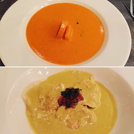 Tomato Cream Soup Starter and Shrimp Ravioli Main Entree from "Vento" Restaurant--Paradisus La Perla Playa del Carmen Resort