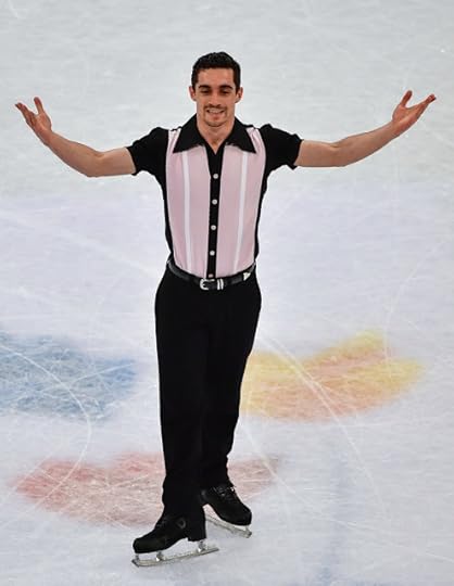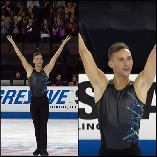 Adam Rippon Free Skate to Arrival of the Birds ("Crimson Wing" soundtrack) by The Cinematic Orchestra, O by Coldplay: For his Free Skate, he wore another semi-sheer top with black pants. Adam has never met a sheer/illusion shirt he didn't love! While yes, this might be a bit repetitive...A) Adam has the .000032% fat-free body to pull it off...and B) this top had sleeves, thank you very much! The music--and his skate--involved birds of sorts, and he showed this beautifully in his choreography. The costume gave "hints" of the feathers, as you can see in the stitched applique work and raw-edged neckline. I loved this and therefore, Adam is on my "Best of 2016-2017 Figure Skating Costumes" List.