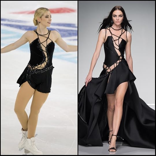 Gracie Gold USA Short Program: Now, speaking of her Short Program...Gracie skated her Short Program to Assassin's Tango (from "Mr. and Mrs. Smith" soundtrack) by John Powell wearing this very modern black costume. I loved it! It was fresh, directional and fashion forward, especially when it comes to figure skating costumes. I loved the bias binding "spider web-like" detail and the subtle silver crystal embellishment. For some reason I kept thinking that I had seen this look somewhere before...and yep, I was right: It was very reminiscent of this look (right photo, above) from Atelier Versace Haute Couture Spring/Summer 2016. Gracie's costume was a very well done knock-off and I loved the obvious inspiration from actual Hi-Fashion runway shows.