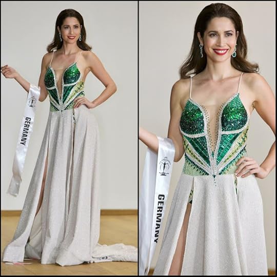 6. Miss Supranational Germany Anja-Vanessa Peter: I don't even know where to begin with Miss Supranational Germany and this gown. Maybe I'll start with the obvious: THAT "Peacock"-inspired sequined top! First of all, the fit is awkward; it's way too low and makes her look as if she has "Sagging Boob Syndrome". I also think it's a bit too "Showgirl/Las Vegas". And then (yes, there is more!), IT'S A SEQUINED LEOTARD/BODYSUIT...with an attached ivory double-front split skirt. There are so many things wrong with what I just typed, I am shaking! But God bless her, she is a trouper: Smiling through it all.