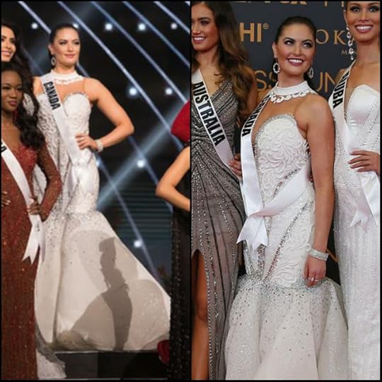 9. Miss Universe Canada Siera Bearchell: Miss Universe Canada wore this white mermaid-style gown for the Miss Universe 2016 Finals Evening Gown competition. In front of MILLIONS of viewers! The dress featured a fitted torso with sequins and applique, sweetheart neckline, nude illusion, full mermaid-style organza skirt section and (if that wasn't enough!), a neck piece. It was A LOT, overwhelming, kind of Tacky-licious and waaaaay too 1980s Pageant Betty. Compared to many of the "Miss Universe 2016" Semi-finalist's gowns, this was just unacceptable. On a good note, Siera's hair and makeup (accentuating those Elizabeth Taylor-like eyes!) was perfect!