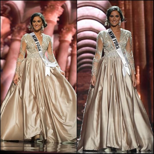 11. Miss New York USA Serena Bocaj: Miss New York USA was a gorgeous contestant who made a wrong gown choice. When her name and state was called during the Evening Gown portion, I could not believe that she walked out in this golden-silver gathered gown mess. She looked MUMSY, like the mother-of-the-bride. Why would she allow herself to be swallowed up in this concoction? And to add insult to style injury, the fit was awkward at best: It is high-waisted and therefore cutting her body off, it is too heavily ruched at the waist and front (it should have been FLAT with no ruching at the front), and the sequin top didn't help at all. I hope she gave this to Goodwill or Out of the Closet.