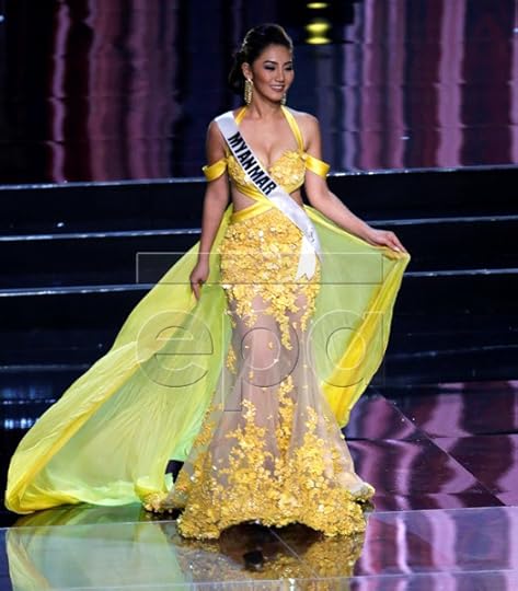 12. Miss Universe Myanmar Htet Htet Htun: Htet Htet won the Best National Costume Award for the 65th Miss Universe Pageant--and for good reason! Hers was my favorite!--but she's not getting any trophies for this gown from me! This highlighter yellow nude organza, chiffon, sequined dress is just too tasteless and tacky. There's too much going on, too much "boob-age", too much of everything. It's like a gown the wife of a nouveau riche Russian Oligarch would pay thousands of dollars for because she thinks it "looks expensive". Nope, it looks TACKY.
