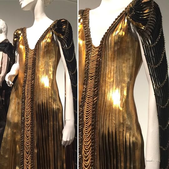 "The Huntsman: Winter's War"--Costume Designer Colleen Atwood--The main section of actress Charlize Theron's "Queen Ravenna" (lower photo) costume is made of leather that has been gold foiled and done to resemble Venetian blinds. Seriously!--25th Art of Motion Picture Costume Design Exhibition, FIDM Museum