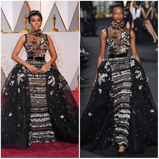 Actress and singer Janelle Monae chose this Elie Saab Haute Couture Gown to wear to the 89th Annual Academy Awards. Janelle is always a fashion risk-taker, and this certainly is quite a statement! I was hoping someone would make a BIG fashion splash on the Red Carpet tonight, but I'm not sure this is exactly what I had in mind. While it is undeniably a exquisitely made gown and I understand how Janelle and her stylist felt that it fit within her aesthetic, I think that this is just too much dress for her.