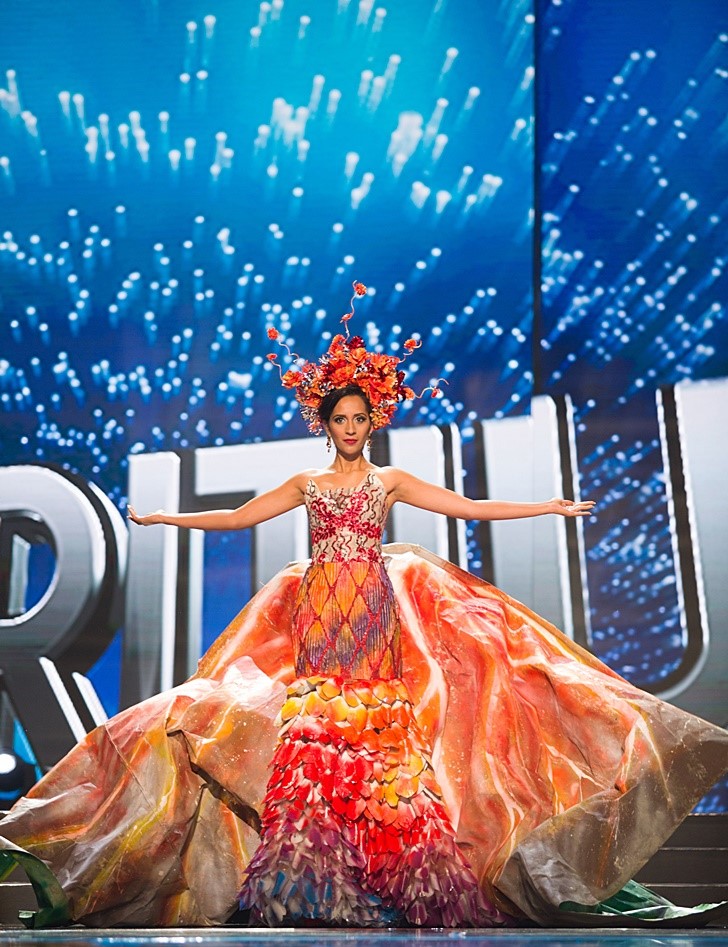 8. Miss Universe Mauritius Kushboo Ramnawa: Kushboo's National Costume was designed by a Filipino designer Kirsten Regalado and assisted by 4 high school students from Bacolod City Philippines. The ensemble was inspired by the volcanic eruption that created her island nation and it is made of recycled materials. The headdress is made of red fabric petals representing the volcanic eruption and also the flora of Mauritius after the volcanic eruption. The detachable cape made of eco-fabric material is hand painted to show the volcano on the outside of the cape and then the volcanic eruption inside...