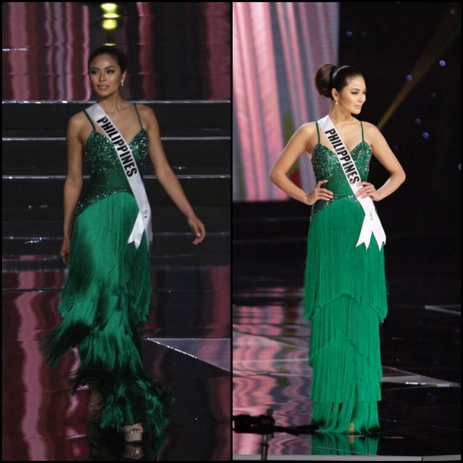 12. Miss Universe Philippines Maxine Medina: Maxine wore this emerald green gown from Filipino designer Rhett Eala. Maxine has been wearing many of his designs for her time during the 65th Miss Universe. She's his muse, one would say. This gown featured a sequined top section and "Chicago: The Musical"-worthy fringed bottom half. the gown was not as dramatic or had the "Oh No She Didn't!" effect as some of the other contestants (Hello "Miss Venezuela" and "Miss Thailand"!), but it was stage-effective and looked nice on her. I have a feeling she might "bust out" with a more "You Go Girl!" gown for the Finals...we'll see.