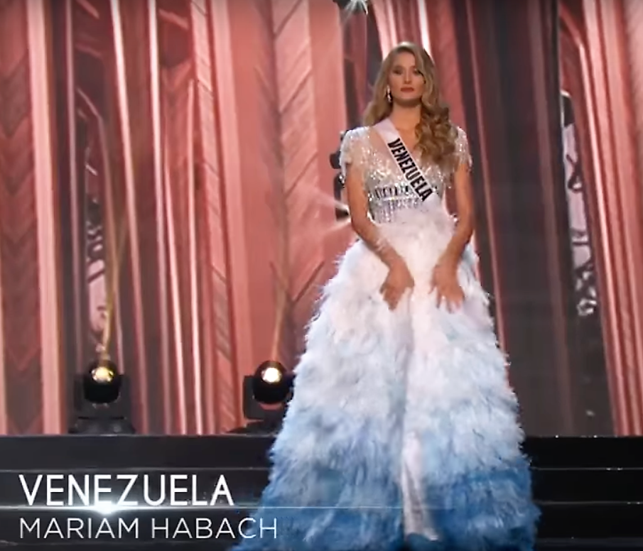 14. Miss Universe Venezuela Mariam Habach: One word--WOW! Mariam--who was a BIG FAVORITE to win the crown but didn't even place into the Semi-Finals--entered the stage in what first looked like a ballgown with a sequined top and feathered bottom skirt. Then...slowly but surely, she looked to the right and then to the left and VOILA: She unsnapped the feathered white/blue ombre shaded feathered skirt and...With a twirl, showed the inner sequined column gown hiding underneath. It was a MAJAH Pageant Moment and kudos to Venezuelan designer Nidal Noauihed for the design! Watch this video below to see the Gown Moment that I was talking about (and hootin' and hollerin' from the audience!):