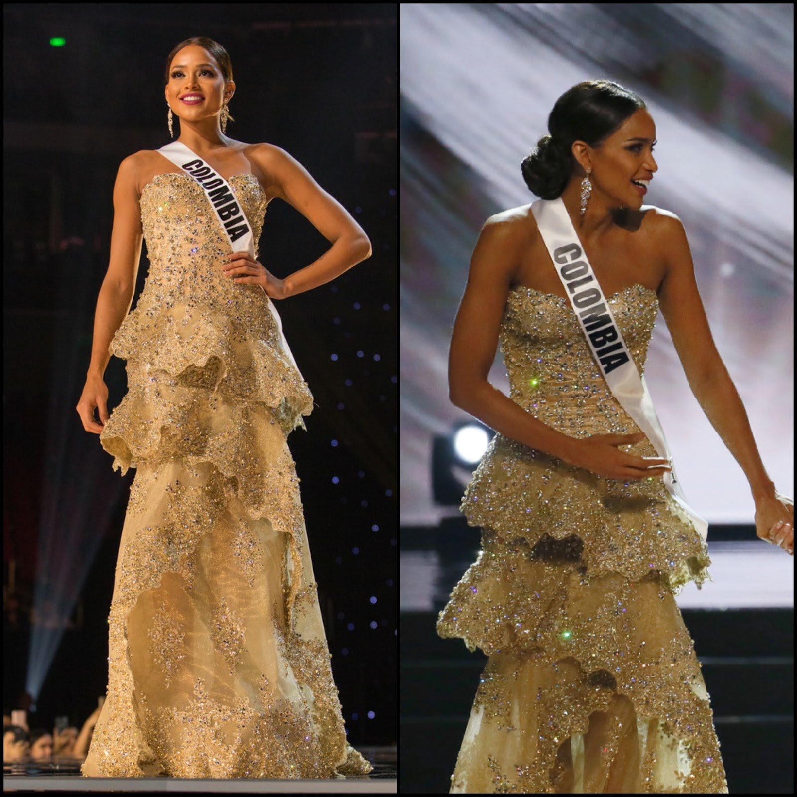 18. Miss Universe Haiti Raquel Pelissier: Raquel is a stunner, let's just begin there. I think it was wise to not weigh down the already 5' 11" beauty with anything overwhelming. I liked this golden column gown that was designed 28 year-old Colombian designer Diego Fernando Marin Mendoza. The style featured crystals throughout--in rose gold and yellow gold--with nude illusion panels. It was reminiscent of Atelier Versace gowns of the past, and I admit, just a teeny tiny "Figure Skating Costume"-like--especially at the top. Yet still, I liked it!