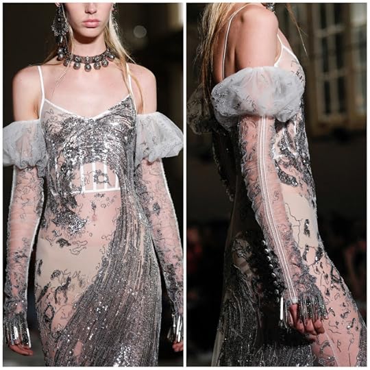Nicole Kidman in Alexander McQueen Spring 2017: It seems as if the 2017 Golden Globes Red Carpet was having a bit of a "Game of Thrones"/Renaissance/Medieval Fashion Moment. There were several cold shoulder sleeves, lots of metallics, and silhouettes that would be perfect for the Daenerys Targaryen's, Cersei Lannister's and a little bit of Catherine de Medici for good measure. And Nicole Kidman was right in there in the fashion moment with this silver and white gown from Alexander McQueen's Spring/Summer 2017 collection by designer Sarah Burton...