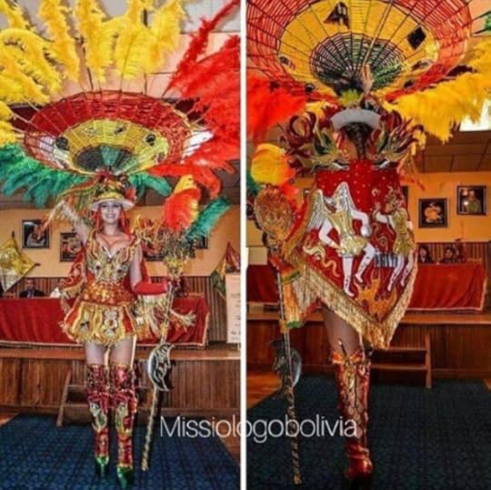 Miss Universe Bolivia Antonella Moscatelli: This festive and colorful costume was created with the help of the Association of Folkloric Ensembles of Oruro (ACFO) and designed by Monika Siles with help from Marcelo Anteza who created the feathered headdress as well as 20+ people who aided in creating the ensemble. The costume represents the allegories in the 18 types of dances in the Carnival of Oruno and is entitled the "Allegory of the Carnival of Oruro". The carnival is a religious festival dating back more than 200 years that takes place in Oruro, Bolivia. It is one of UNESCO's Masterpieces of the Oral and Intangible Heritage of Humanity. The cost of making the costume: $1500--quite cheap for such an elaborate costume!