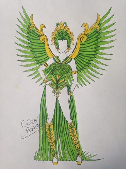 Miss Universe Guatemala Virginia Argueta: Miss Universe Guatemala's national costume is inspired by the Quetzal bird. It is designed by Guatemalan designers Cesar Portillo along with Juan Francisco Arevalo. The pre-Columbian-inspired design is made of feathers, Swarovski crystals and a bustier made of molded glass.