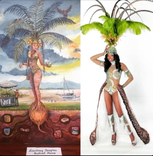 Miss Universe Guyana Soyini Fraser: Miss Universe Guyana's national costume is entitled "The Coconut Queen" and was inspired by a painting at the 2016 Guyana Coconut Festival done by Courtney Douglas (left photo). I think it's fun and quite COCONUT cute!