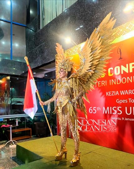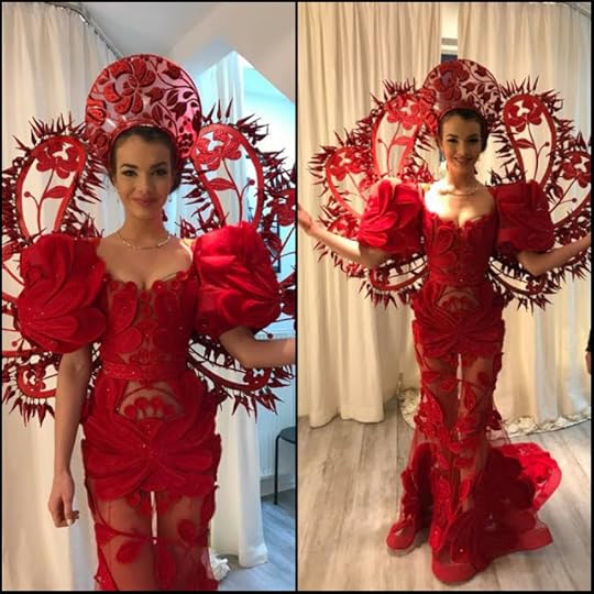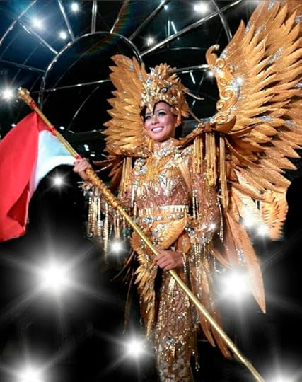 Miss Universe Indonesia Kezia Warouw: This gorgeous golden costume was designed by Dynand Fariz, president of the Jember Fashion Carnaval as well as the JFC creative team. It took two months to create. The theme is "Unity Nation" and inspiration is the iconic Garuda Bird. The Garuda bird represents sovereignty of Indonesia and symbolizes grandeur and glory with its golden color. Those gold feather wings deserve an award right now! I am still at a loss at how these things get transported from country to country and WHO PAYS for the excess baggage fees???
