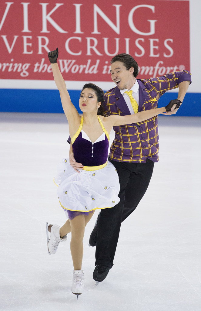 Kana Muramoto and Chris Reed of Japan Short Dance to Blues: The Sun's Gonna Shine Again, Jive: I've Got a Woman, and Swing: Mess Around by Ray Charles: Very bold, very bright. This Japanese Ice Dance team wore these purple and yellow costumes for their Short Dance. While it was a bit "cartoon-y" for sure, I still think they were impacting and in a good way. For some reason, I actually enjoyed his windowpane striped printed jacket and that yellow skinny tie. If there was a Costume Star in this dance, it would Chris!