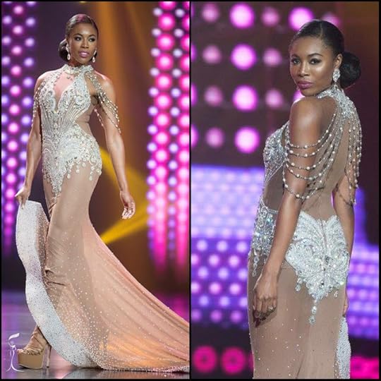 Pascale Dghem: I like how simple and sleek this white high-necked long sleeved gown is. But, at the same time, this is also why I'm not so sure it's impacting enough for an international beauty pageant stage. I think if it was one shoulder or strapless and then had an attached fabulous dramatic matching cape, then I would have given it higher marks.