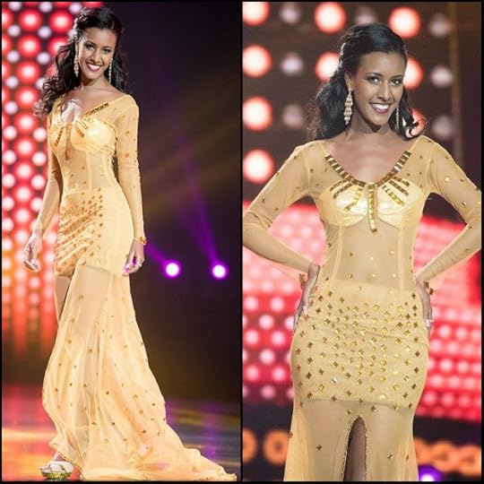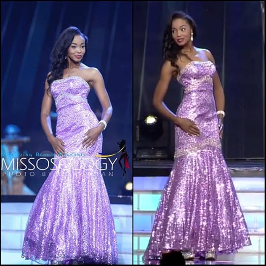Miss South Africa Nozipho Magagula: I liked the color of Nozipho's gown but after that, she lost me. This look was a tad cheap-looking and off-the-rack. The fabric looked like it came from Downtown L.A. Santee Alley and it was too short where you could see her super tacky sequined platform pumps (right photo above). This gown choice was a miss, and a shame, for such a pretty contestant.
