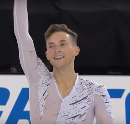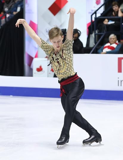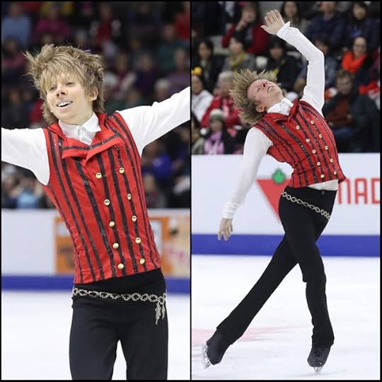 Ross Miner of USA Free Skate to Somebody to Love, Love of my Life, and Crazy Little Thing Called Love by Queen: For his FS, he slightly redeemed himself--costume-wise. I liked the ombre-shaded red-and-black printed top with the gold sequined neckline. This was Ross Miner really stepping out of his costume zone. And I applaud him for it. But, I still think this could have been better; it is QUEEN after all!