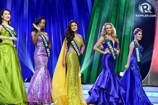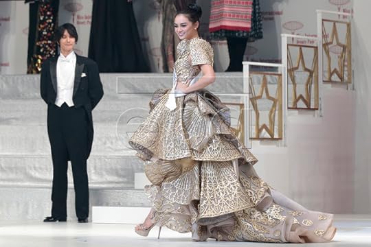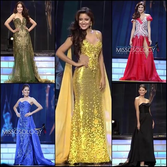Norma Darwich: Norma wore this red sequin-over-tulle fitted gown. I admire all the intricate applique work and how well it fits. The strawberry red color is also perfect for a dark haired woman and I can see this gown making an impact in the international pageant stage. The only thing I have a problem with is the placement of a specific applique right on her you-know-what. It's awkward to say the least and I doubt the lovely Norma would want the judges' (or anyone else for that matter) eyes focused there.