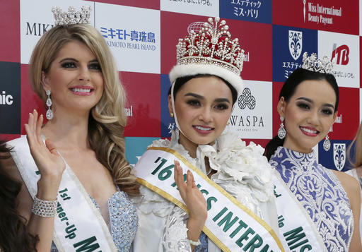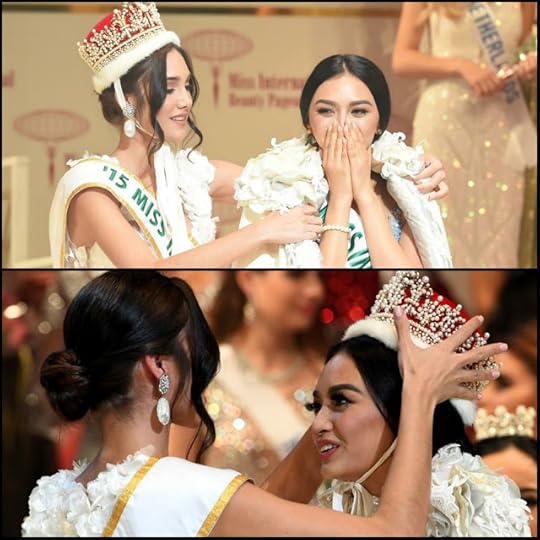 Crowned: Outgoing "Miss International 2015" Edymar Martinez from Venezuela crowns the new "Miss International 2016" Kylie Verzosa--Tokyo Japan