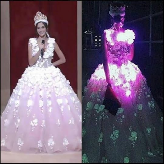 "Miss International 2015" Venezuela's Edymar Martinez: Edymar wore a pink and white embroidered ball gown custom-designed by Venezuelan designer Hugo Espina. It featured built-in lighting (see right photo above). This was quite a "Disney" Cinderella-type gown and very "Miss International" in its "Princess"-like look. While this might have worked in Japan, it was a bit too over-the-top and slightly tacky Quinceañera for my taste. But...I do appreciate that it was probably (most definitely) made impeccably and sewn to perfection.