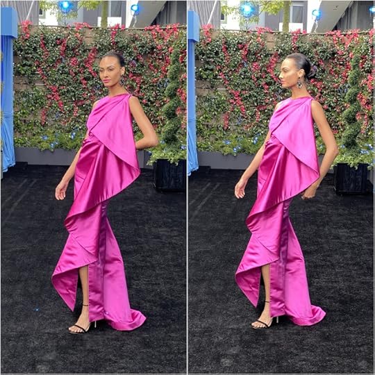 Cascade Flourish--Jayden Robinson in NIKOLAKI fuchsia pink colored silk Duchesse satin "Matador" gown--"Countdown to the Critics Choice Awards", KTLA-5 Studios Hollywood