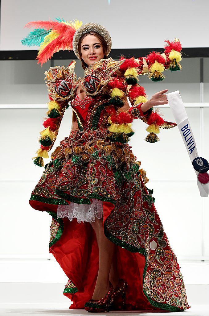 Bolivia Katherine Anazgo: Miss Bolivia's national costume combines several elements of traditional Bolivian culture in one super embellished ensemble. All that sequined applique work is pretty incredible on that high-lo dress plus the inner lace petticoat and the feathered hat and those red, yellow and green pom-pom's...it adds to an impressive costume effort for Miss Bolivia. I also appreciated the matching sequined pumps. Once again, it was a head-to-toe look.