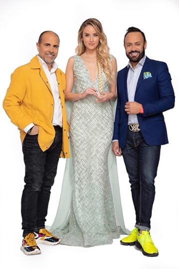 NIKOLAKI Designers and FIDM Fashion Design Co-Chairs, David Paul and Nick Verreos with model Brianna Barnes in NIKOLAKI "Elsa" Gown--Disney X FIDM: Frozen II Collaboration, L.A. Loft Photo Studio, West Hollywood