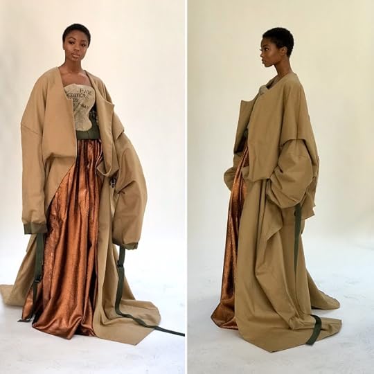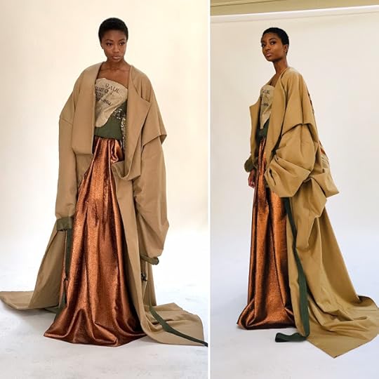 Exaggerated Dimensions--Models Kennedy Givens in khaki canvas coat with exaggerated sleeves, bustier, and copper lame skirt, inspired by "Earth" Elementy from "Frozen II"--Disney X FIDM: Frozen II Collaboration, L.A. Loft Photo Studio, West Hollywood