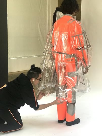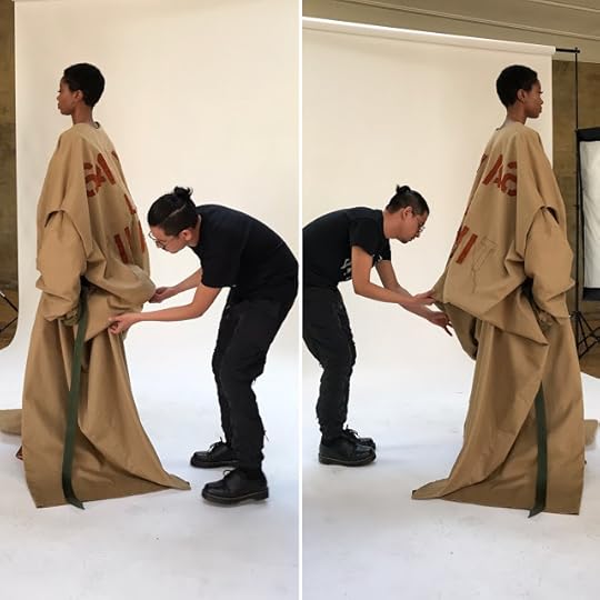 Fixing the "Gale" Coat--FIDM Designer Tomy Huang prepping his coat on a design inspired by the"Gale"/Wing Element from the "Frozen II" film--Disney X FIDM: Frozen II Collaboration, L.A. Loft Photo Studio, West Hollywood