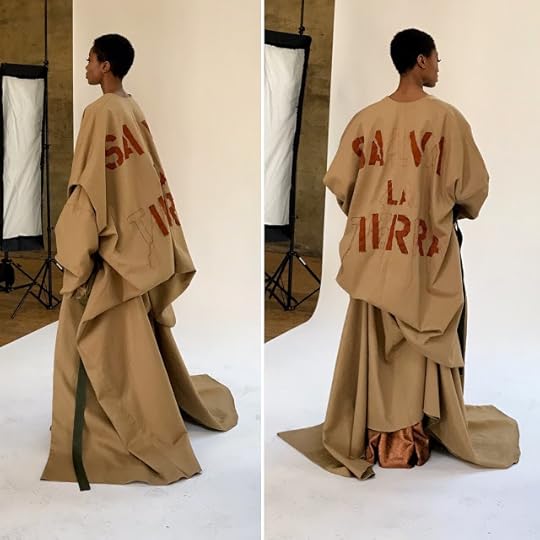 Salva La Tierra--"Save The Earth" in Spanish on the back of Paul Hernadez khaki coat from his "Frozen II" Earth-inspired design--Disney X FIDM: Frozen II Collaboration, L.A. Loft Photo Studio, West Hollywood