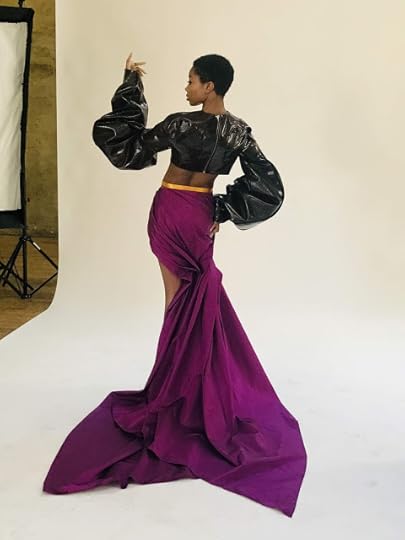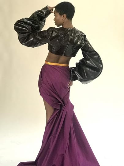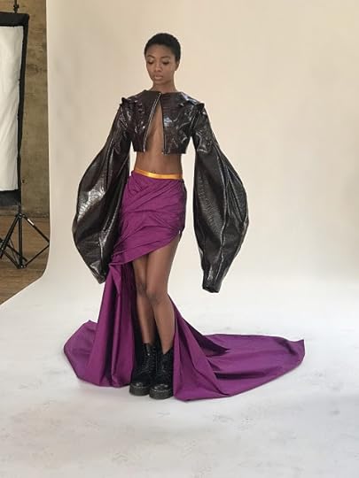 Fire Fabulous--Model Kennedy Givens in "Frozen II" and "Fire" Element-inspired design, consisting of a faux crocodile leather crop top with exaggerated sleeves, and purple colored taffeta draped skirt, from Paul Hernandez--Disney X FIDM: Frozen II Collaboration, L.A. Loft Photo Studio, West Hollywood