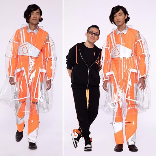 Streetwear Cool--FIDM Designer Tomy Huang (right photo) with model Jaewon Kyung in his "Gale"/Wind Element from "Frozen II"-inspired design--Disney X FIDM: Frozen II Collaboration, L.A. Loft Photo Studio, West Hollywood