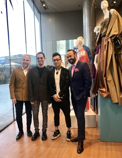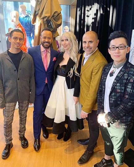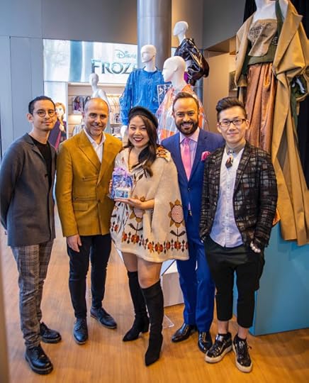 FIDM Fashion Design Co-Chairs and NIKOLAKI Designers Nick Verreos and David Paul with FIDM Designers Paul Hernadez and Tomy Huang, with Disney Digital Creator Keshia Sih-Tseng (center)--Window Unveiling at Disney Store Westfield Century City of Disney X FIDM: Frozen II Collaboration