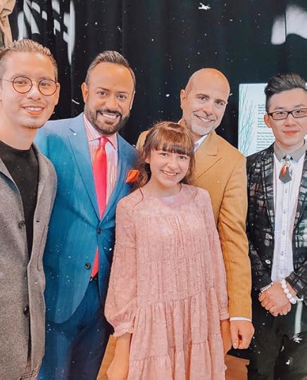 FIDM Fashion Design Co-Chairs and NIKOLAKI Designers Nick Verreos and David Paul, and FIDM Designers Paul Hernandez and Tomy Huang, with Disney Fan Natasha (center)--Window Unveiling at Disney Store Westfield Century City of Disney X FIDM: Frozen II Collaboration