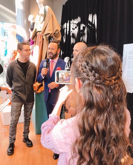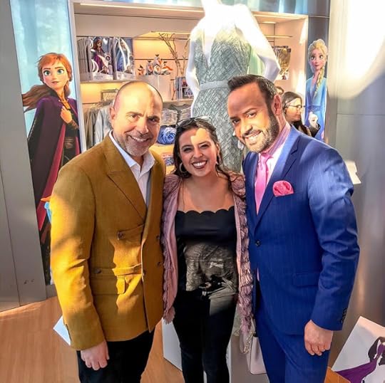 FIDM Fashion Design Co-Chairs and NIKOLAKI Designers David Paul and Nick Verreos with Blogger and Disney Fan Ashley Nicole (center)--Window Unveiling at Disney Store Westfield Century City of Disney X FIDM: Frozen II Collaboration