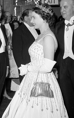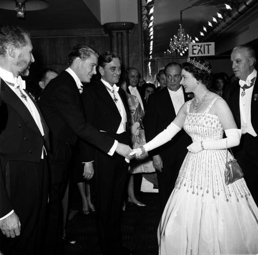 Queen Elizabeth wore the gown to the Premiere of "Lawrence of Arabia" back in 1962, looking quite elegant, and regal. The gown featured a typical-of-the-period fit-and-flare full dress silhouette and stunning sequin embellishment highlighting the torso, upper bust and then creating a nipped-in-waist.