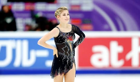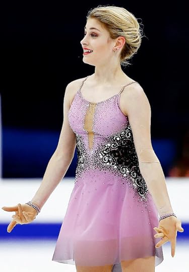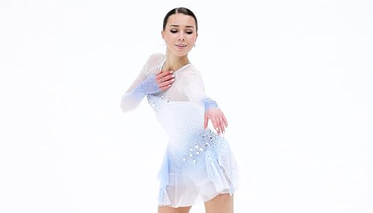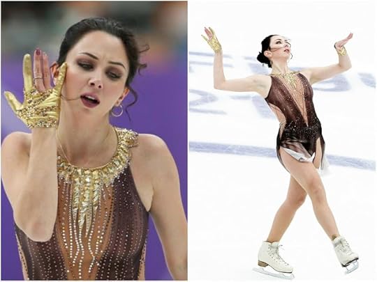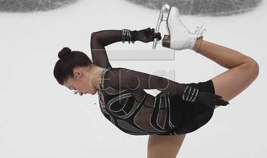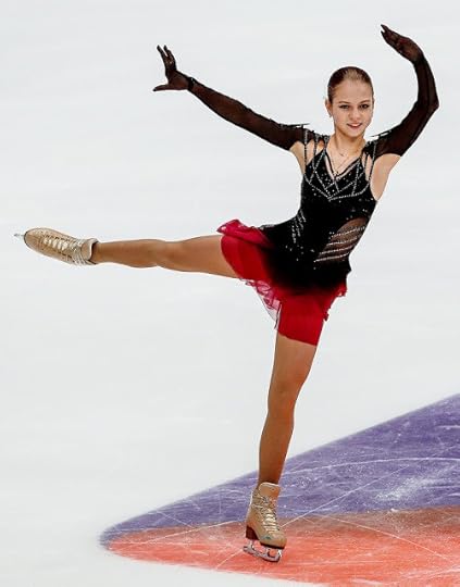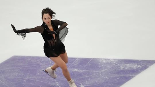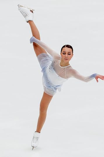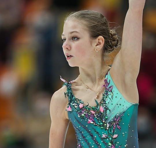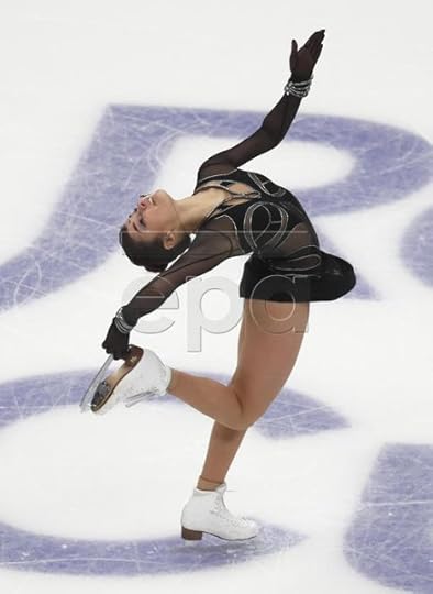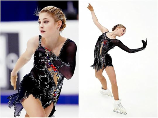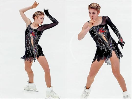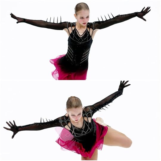 Free Skate to "Chronicles of a Mischievous Bird" by Bkhima Iunusov--For her Free Skate to the Japanese-like music of "Chronicles of a Mischievous Bird", Elizaveta wore this elegant black costume featuring chiffon flutters at the sleeve, to mimic a bird's wings (and possibly a Geisha's kimono). I liked the boning-like detail at the midriff and sequined collar which, along with the sleeve "wings", added a mysterious air of a dark and emotionally complicated bird. If there was any critique, it would be the too-dark nude-colored panel in the front; it was a bit distracting and cheesy--and too dark for her porcelain skin color.Score: 9.25