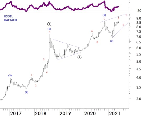 USDTL’de de yön yukarı, ancak kısa vadeli yükselişin Şubat ayında 6.88’den başlayan yükseliş dalgasının son atağı olma ihtimali var. Yukarıdaki grafik de bu ihtimali gösteriyor. Eğer bu sayım doğruysa yükselişin 9.0-9.30 bölgesinde tıkanma ihtimali var.