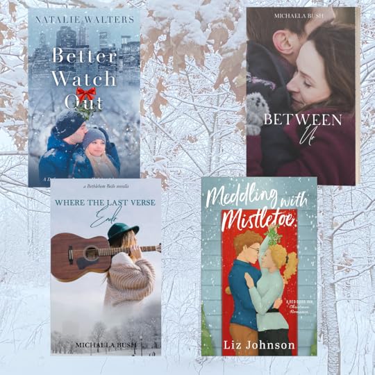 Between Us by Michaela Bush (yours truly) -- for a plot around healing, sweet romance, a Christmassy wedding, and forgiveness, this is the novella sequel to Back to Me. It's a quick read, too, and full of heart. (PLUS they go caroling at a super cool Victorian historical museum. Which was a blast to research.)