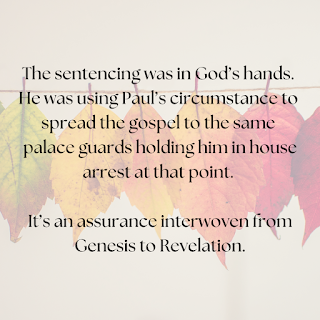 It's the same assurance woven through the entire Bible from Genesis to Revelation. Notably, Genesis 50:20 when Joseph tells his brothers that, even though their actions were meant for evil, the Lord turned it for good and the rescuing of many people. We see it time and time again through the Bible, not just with Joseph and Paul. David, too, shows this change from sorrow to delight in many of his psalms. Because the Lord takes darkness and turns it to light--and He is the only one who can. We must only be obedient and moldable.