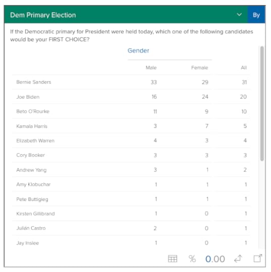 Sen. Kamala Harris (5%), Sen. Elizabeth Warren (4%), Sen. Cory Booker (3%), Andrew Yang (2%), Mayor Pete Buttigieg (1%), former Sec. Julian Castro (1%), Rep. Tulsi Gabbard (1%), Sen. Kirsten Gillibrand (1%), Gov. Jay Inslee (1%) and Sen. Amy Klobuchar (1%). Several other candidates polled at less than one percent at this early stage.