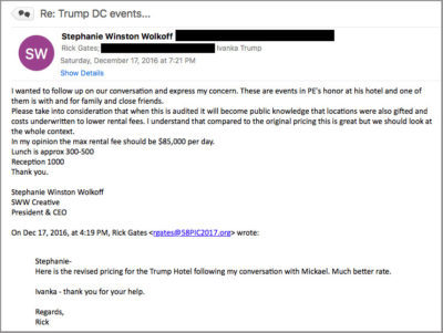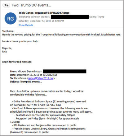 Emails show that Ivanka Trump connected Gates with Mickael Damelincourt, managing director of the hotel. Damelincourt responded with a new rate of $175,000 per day for use of the Presidential Ballroom and meeting rooms, offering a $700,000 charge for four days of use.
