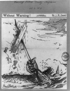 “Without Warning!,” a 1917 cartoon in the Evening World Daily Magazine, depicts a sword rising from the sea to destroy a U.S. merchant vessel. Above the waves can be seen part of a German helmet. Such cartoons proliferated after the sinking of the luxury liner Lusitania in 1915.