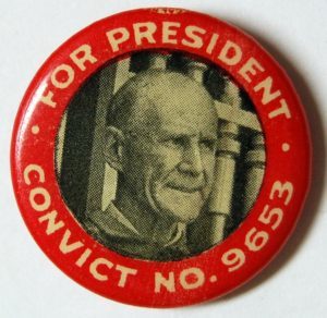 A campaign button for Eugene Debs, the Socialist Party candidate for president in 1920. Though he ran from federal prison he received over 900,000 votes.