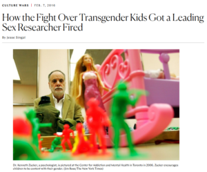 This framing is not new for news media. Writing for the “culture wars” section of The Cut (2/7/16), Jesse Singal previously wrote on the firing of sexologist Kenneth Zucker, who is most famous for arguing against accepting the gender identification of transgender youth. Singal framed Zucker’s firing, from the Child Youth and Family Gender Identity Clinic in Toronto, as the result of transgender activists who were opposed to the questions Zucker is asking. This was depicted as an important debate being been shut down—“allowing a vital scientific question…to be decided by activists.”