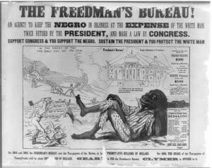 The language of this 1866 political cartoon says, in part, “The Freedman’s Bureau! An agency to keep the Negro in idleness at the expense of the white man. … Support Congress & you support the Negro. Sustain the President & you protect the white man.”
